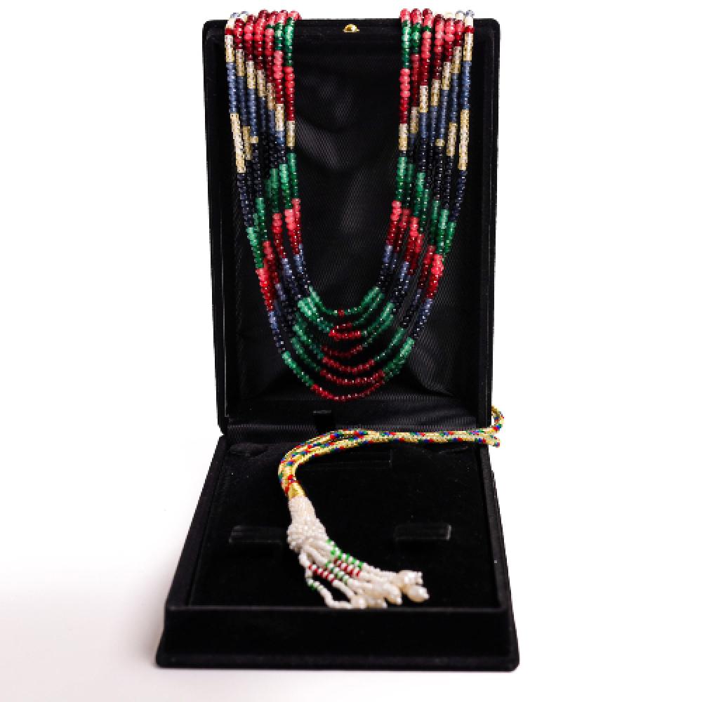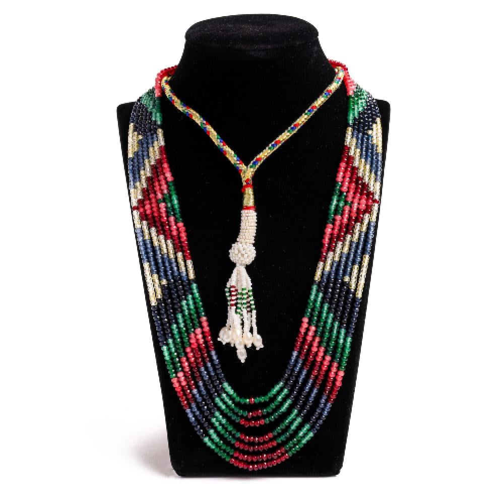 ارتقي بإطلالتك مع هذا العقد الفريد المصنوع من أحجار كريمة طبيعية مختارة بعناية، تجمع بين جمال الزمرد الأخضر، والياقوت الأحمر، والزفير الأزرق لتمنحك قطعة نابضة بالألوان والطاقة الراقية. تصميمه متعدد الطبقات ولمعته الساحرة يجعلان منه إضافة فاخرة لأي مناسبة.